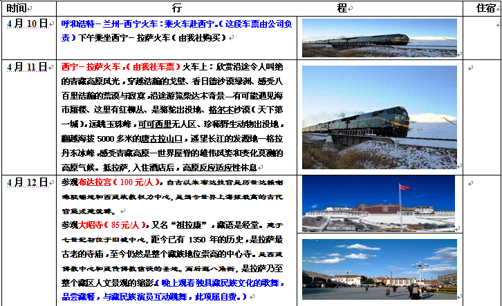 公司保健醫生全程陪護并給每位游客送全險一份 備注:尊敬的組團社,根據2009年5月1日起,旅游新法規有關(guān)條例規定, 參團游客在我地旅游中所為游、購、娛、吃、住、行,以實(shí)事求是的原則、以參團游客的意見(jiàn)單簽字為準,回家再有投訴不于認可.請尊照執行. 自費項目:羊八井洗溫泉98元/人,(可洗或不洗,以自己身體素質(zhì)決定,不限制.自帶游泳裝備) 自費項目:西藏具有特色的藏歌藏舞,有兩種檔次《唐古拉風(fēng)》180元/人含風(fēng)味藏晚餐,一種是280 元/人不含餐《幸福在路上》、《喜馬拉雅》 總價(jià):4200元/人 全程跟蹤拍攝,免費送碟(光盤(pán)) 公司地址:內蒙古呼和浩特市長(cháng)安金座D座9樓9012室 電話(huà):0471-4687717 4687787 13848137064 18748124680 QQ: 1459869907 410116697 |