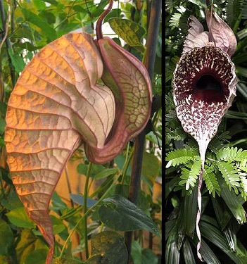 巨花馬兜鈴學(xué)名為“Aristolochia grandiflora”。這種植物的奇特之處在于它們美麗而怪異的花朵?;ǘ涞闹饕糠种挥幸黄?,看起來(lái)好象是一個(gè)巨大的、帶有紋理的兜狀物,而不像普通的花朵那樣擁有對稱(chēng)的花瓣。觀(guān)賞者千萬(wàn)不要太靠近它,否則它所發(fā)出的死老鼠味道會(huì )在你們身邊數小時(shí)不散。不過(guò),巨花馬兜鈴雖然會(huì )發(fā)出死老鼠味道,但它們并不像巨型豬籠草那樣吃老鼠,它們這種氣味不過(guò)是用來(lái)吸引傳粉昆蟲(chóng)幫助它們傳粉而已。